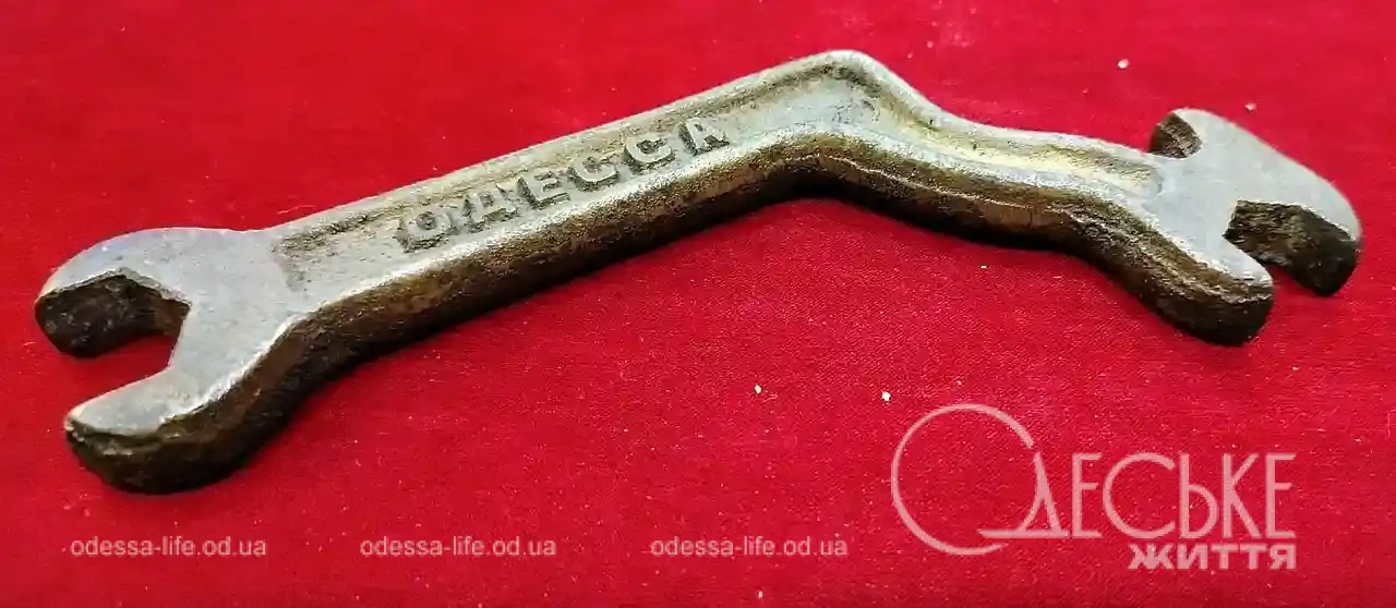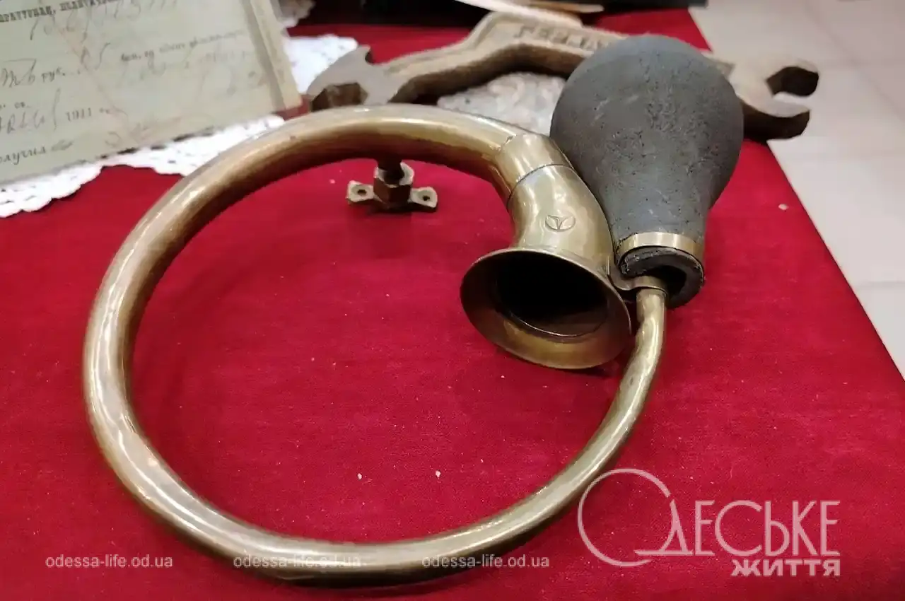 На полиці лежить старовинний клаксон від ретро-автомобіля — схожий на той, що колись лунав біля Оперного театру. Поруч — каретний ключ і пароконний жетон, що нагадують про час, коли кінь ще змагався з мотором.