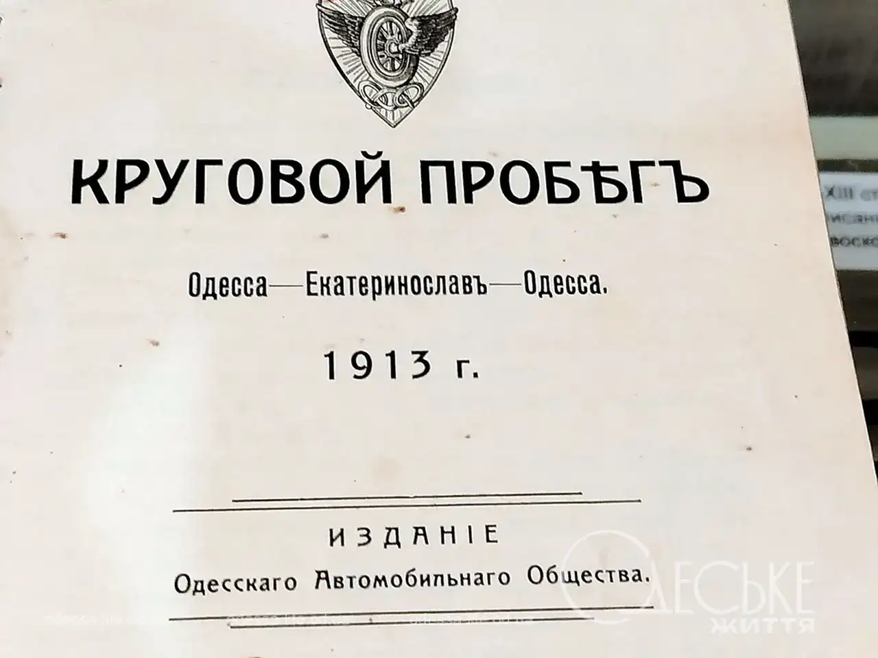 А ще — рідкісне видання «Круговой пробег Одесса-Єкатеринослав-Одесса» (1913 рік), видане Одеським автомобільним товариством. Саме з таких книжок і газет починається історія одеського транспорту — з запахом бензину, шкіри та нових доріг.