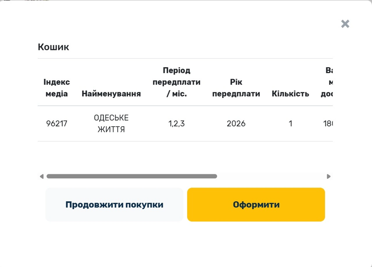 Оформити передплату на сайті “Укрпошти” вже можна онлайн, а з 27 жовтня це можна буде зробити у поштових відділеннях за друкованими каталогами. Передплата за “Каталогом регіональних медіа України на 2026 рік (І півріччя)” триватиме до 25 грудня 2025 року. Передплатний індекс «Одеського Життя»: 96217.