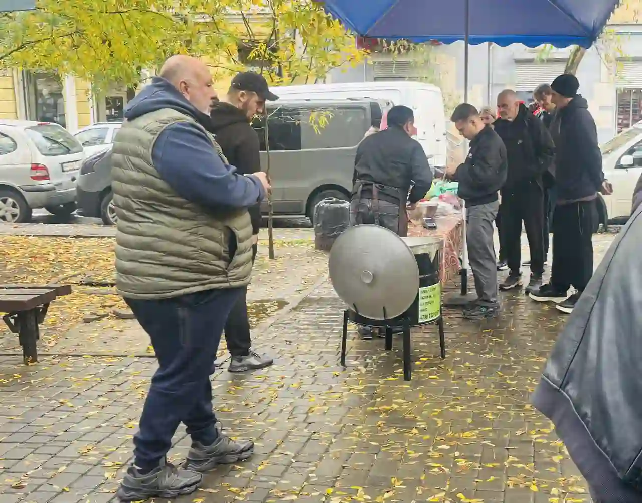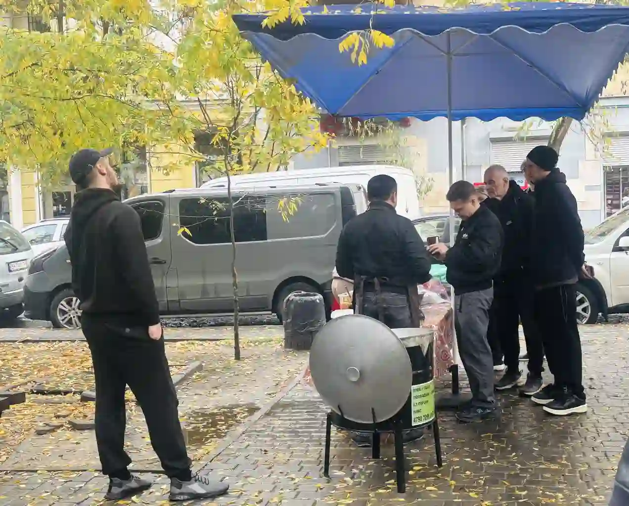 Шукати точку продажу плову довго не довелося. Я побачила велику чергу поряд зі столиком під великою синьою парасолькою. В черзі чомусь стояли виключно чоловіки. На моє жартівливе запитання, чи продають плов жінкам, чомусь не відреагували.