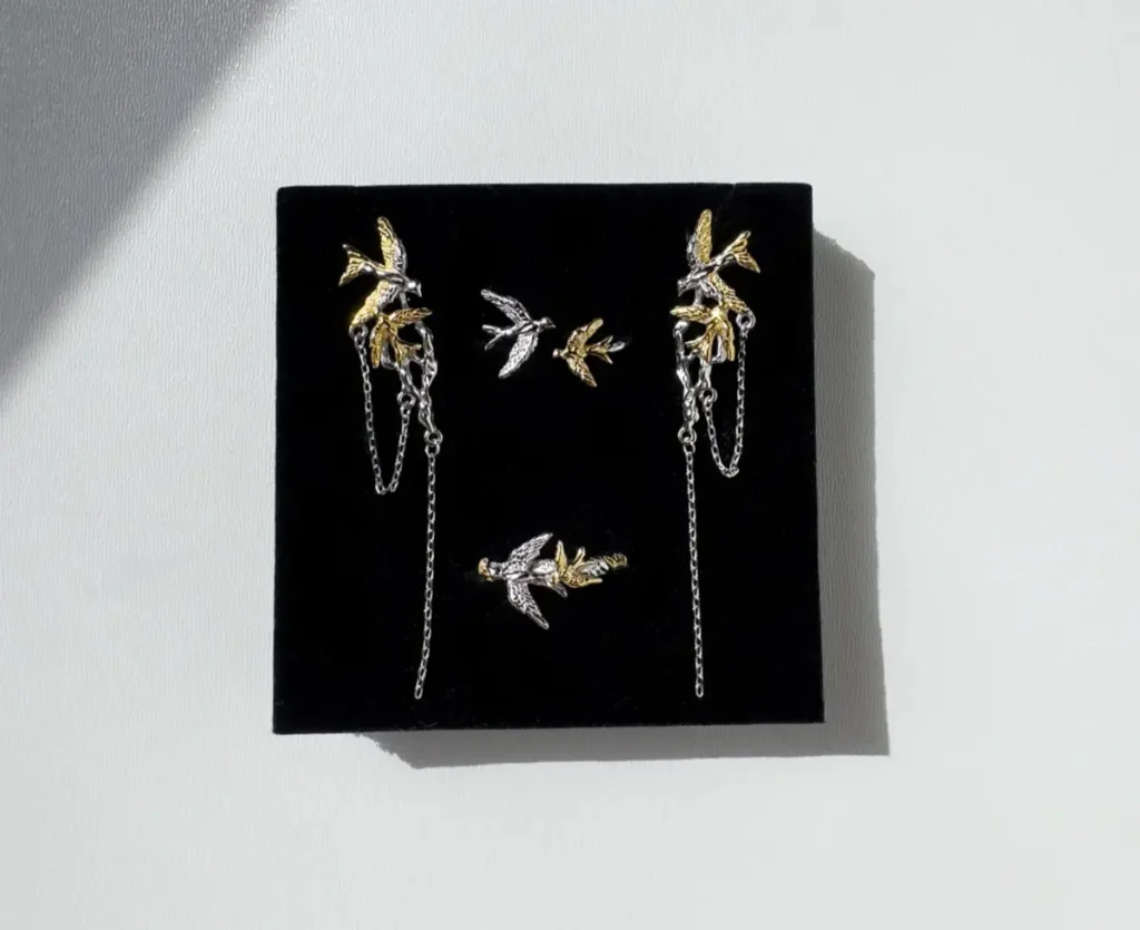 Якщо хочеться трохи динаміки — варто придивитися до моделей із підвісками або ланцюжками. Рух прикраси додає образу живості. Ластівки, до речі, мають символічне значення — їх часто асоціюють із свободою та легкістю.