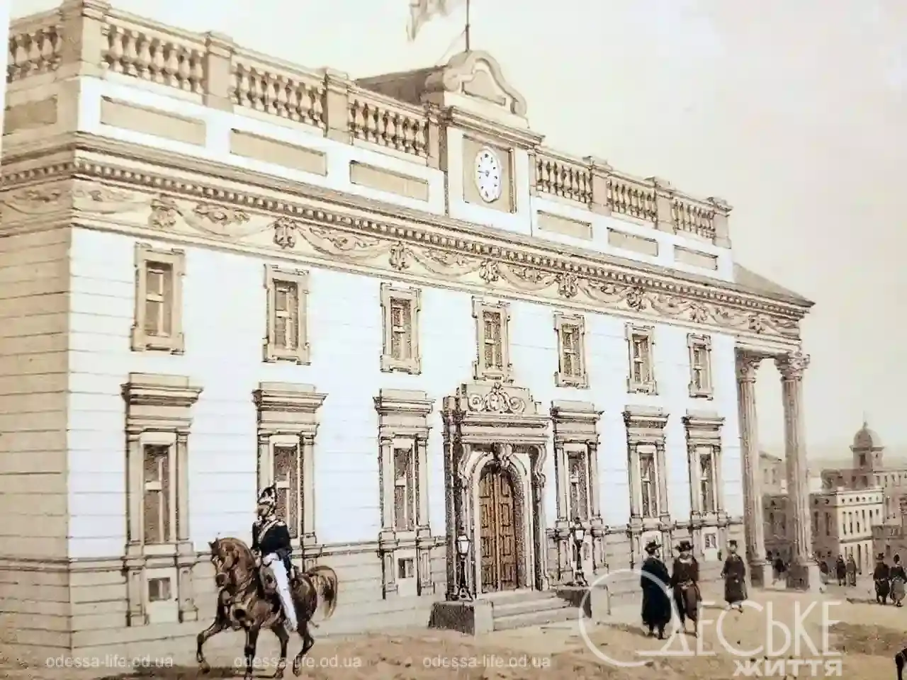 Як розповідає засновник Музею-кав’ярні «Стара Одеса» Петро Манелис, літографію було створено у Парижі, у відомій друкарні Lemercier. Її автор — Ph. Benoit (Ф.Бенуа), майстер міських пейзажів і архітектурних видів. Він зобразив не просто будівлю, а живу сцену: екіпажі біля театру, людей у довгих пальтах і циліндрах, прапор над фасадом, годинник під фронтоном. Це Одеса, яка тільки вчиться бути великою культурною столицею.