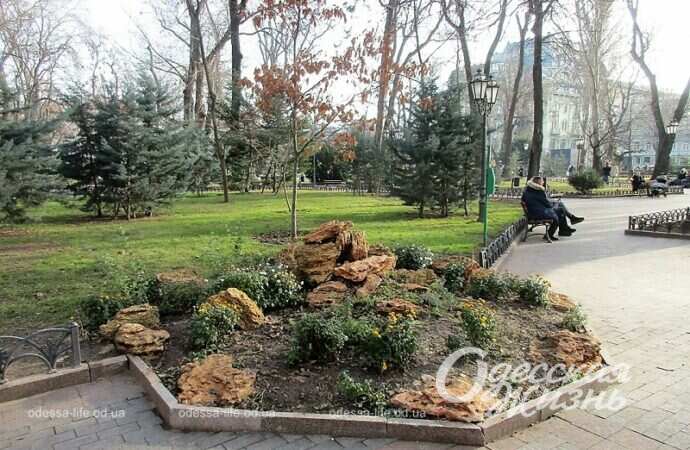 Ось і дід одеський Міськсад ніяк не схожий на новорічний. Багато лав зайняті, таке враження, що одесити прийшли не так продихатися, скільки на сонці погрітися. Навіть місцеві коти доглянули собі містечко на лавці.