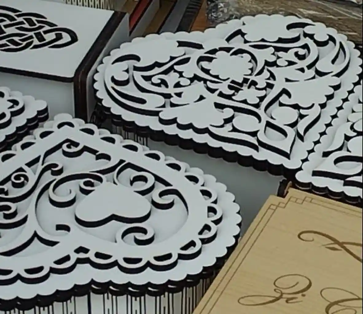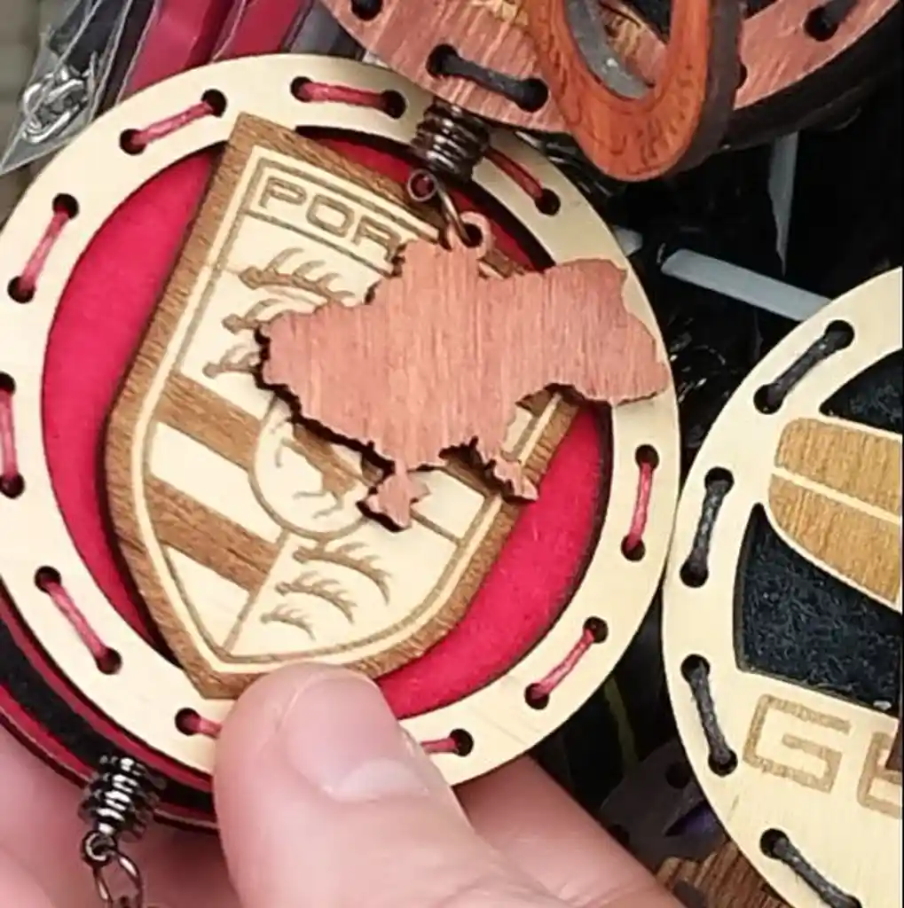Молоде подружжя придбало лазерний граверний станок, фанеру – і занурилось в експерименти. Спочатку почали виготовляти ароматизатори для автівок. Лазер вирізає невеличку форму, наносить зображення та написи. Усередині – шматочок войлоку, який утримує аромат. Фініш – ручне прошивання шнурками.
