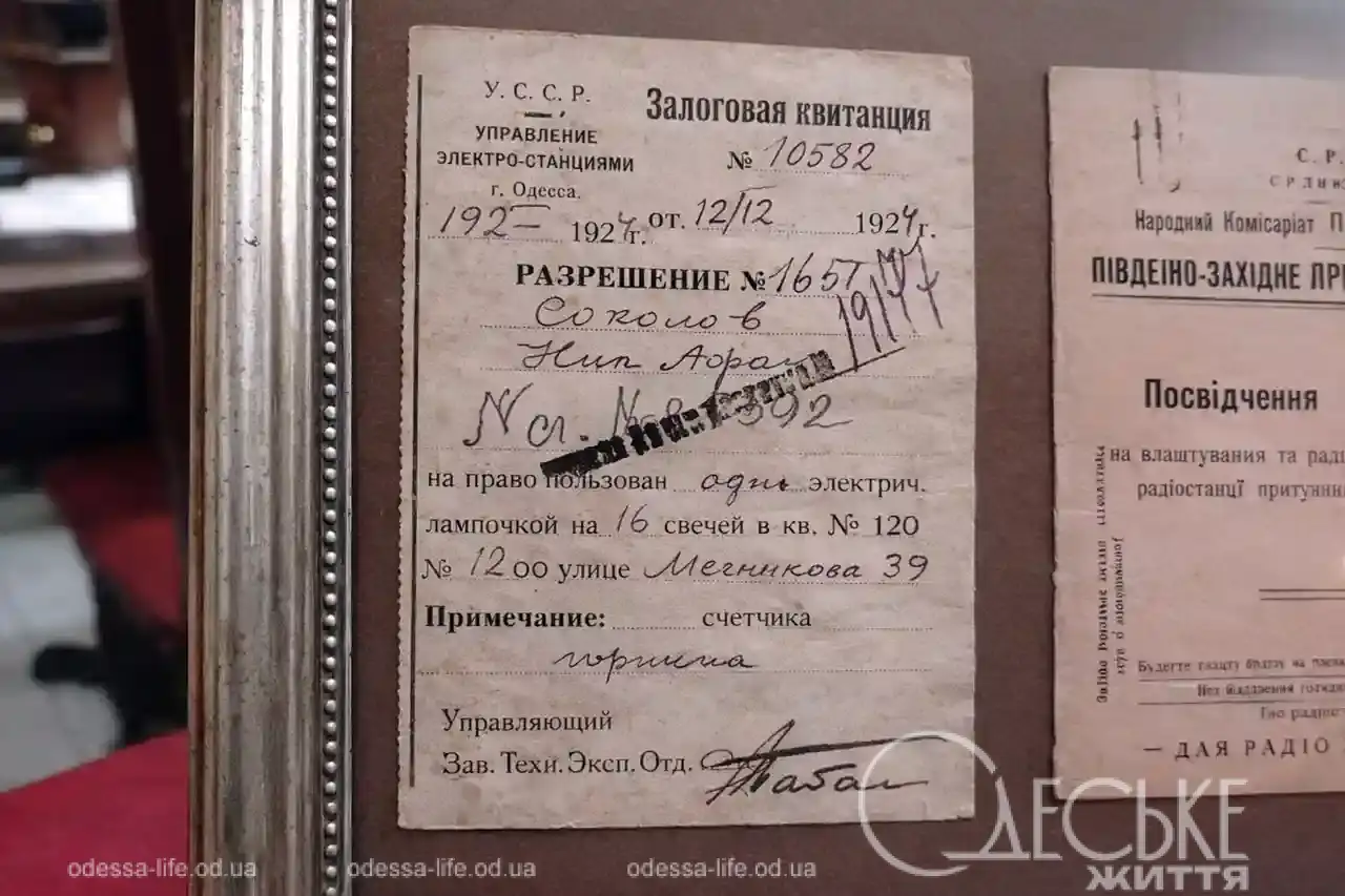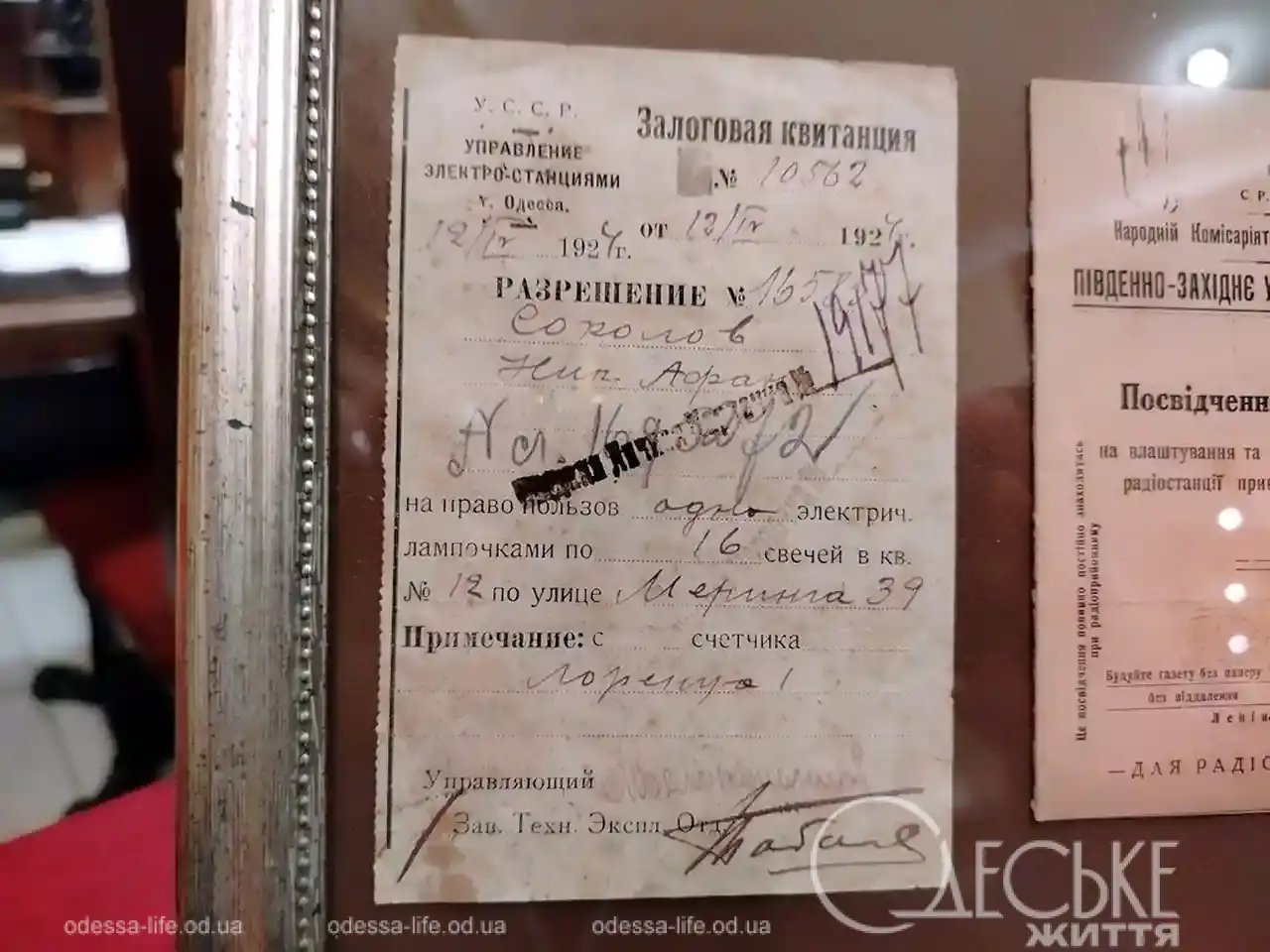 В кав’ярні-музеї «Стара Одеса» показують документи та речі, з яких видно, що світло в минулому було не завжди доступним. Серед експонатів — дозволи на електролампочки та предмети, які дають уявлення про те, як люди освітлювали свої домівки від античних часів до початку ХХ століття.
