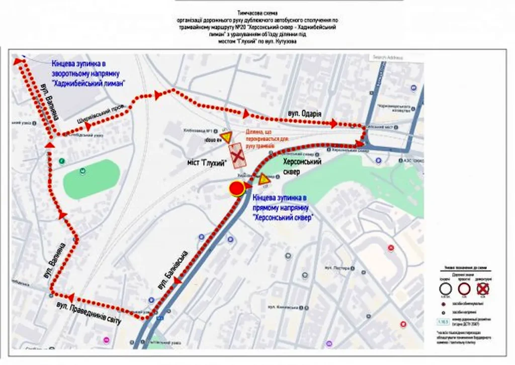 Замість трамваїв організовано дублюючий автобусний маршрут сполученням «Херсонський сквер – Хаджибейський лиман». Автобуси рухаються за колишнім трасою трамваю № 20 із об’їздом пошкодженої ділянки під мостом «Глухий».