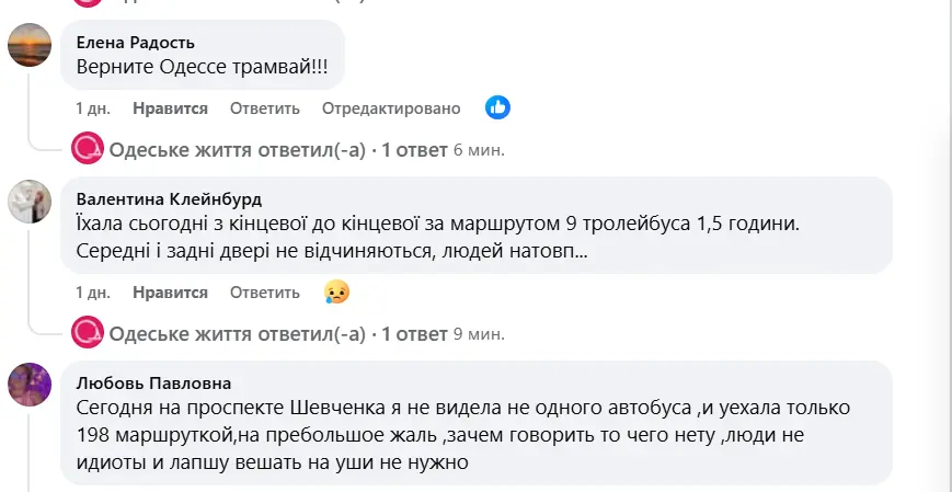 Редакція “Одеського життя” подала офіційний запит до влади ще 7 січня, щоб отримати відповіді на найпоширеніші запитання пасажирів. Проте замість змістовної інформації журналісти отримали низку формальних відписок і перенаправлень між відомствами. Міська адміністрація досі не надала роз’яснень щодо подовження графіку руху та усунення проблем із розкладом.
