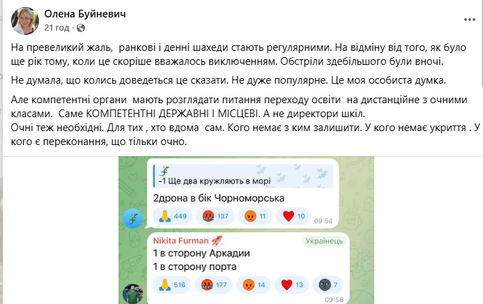 Колишня керівниця департаменту освіти і науки Одеської міської ради Оксана Буйневич висловила стурбованість регулярними атаками “шахедів” на місто у своєму дописі в соцмережах. Вона додала, що повітряні тривоги, на жаль, стали нормою, на відміну від ситуації рік тому. Адже у 2025 році обстріли переважно відбувалися вночі.