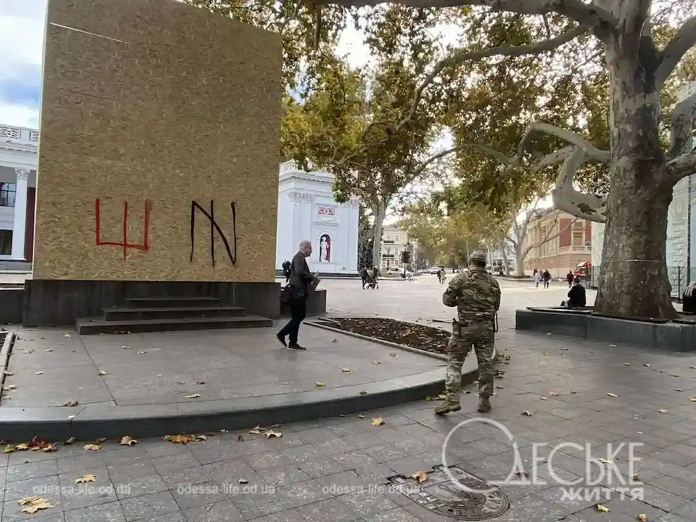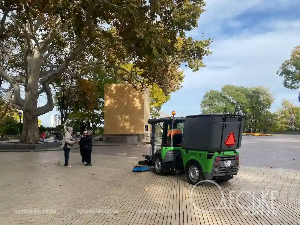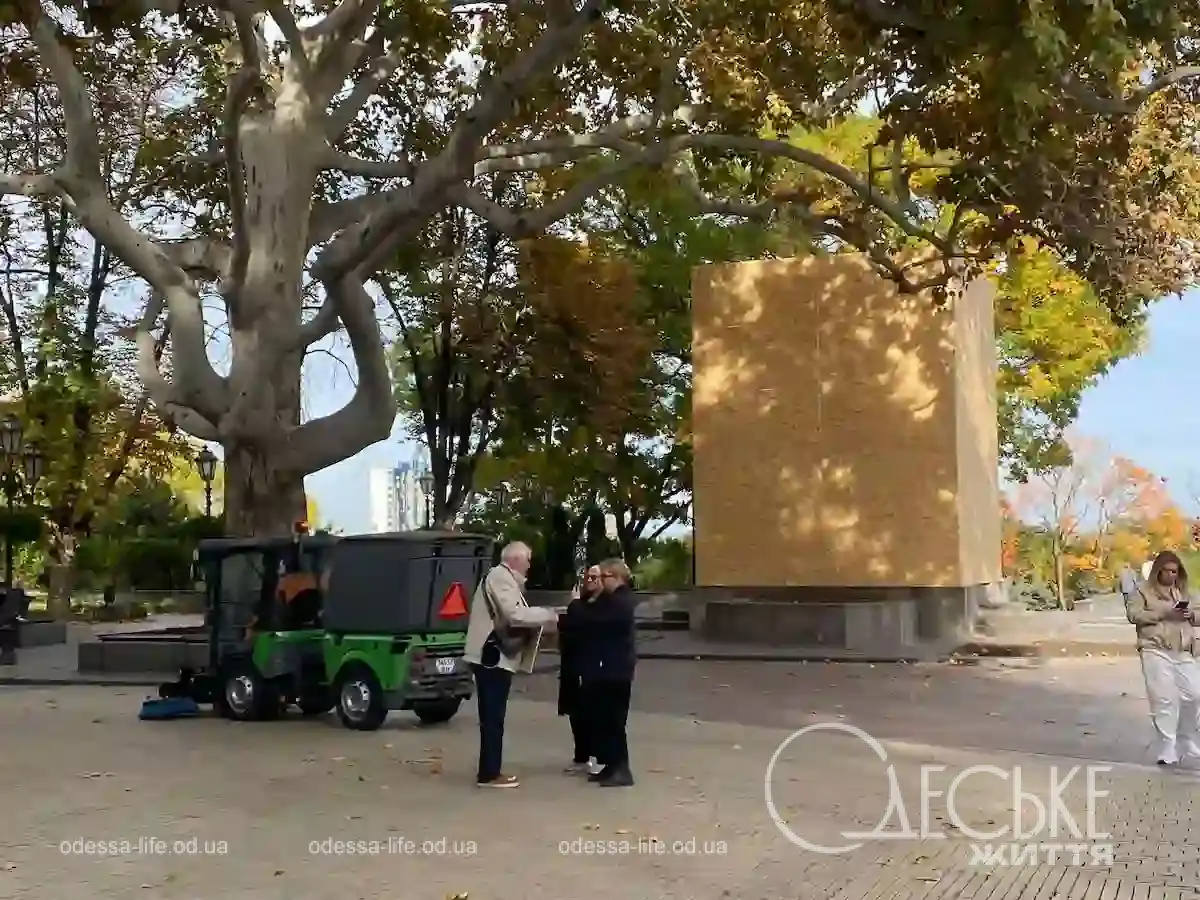Як повідомляє кореспондент «Одеського життя» з місця події, біля монумента працюють комунальники, площу прибирають, а в повітрі відчувається запах свіжої деревини. Життя навколо триває — хтось гуляє, хтось стоїть в одиночному пікеті, але увагу городян привертає саме укритий монумент.