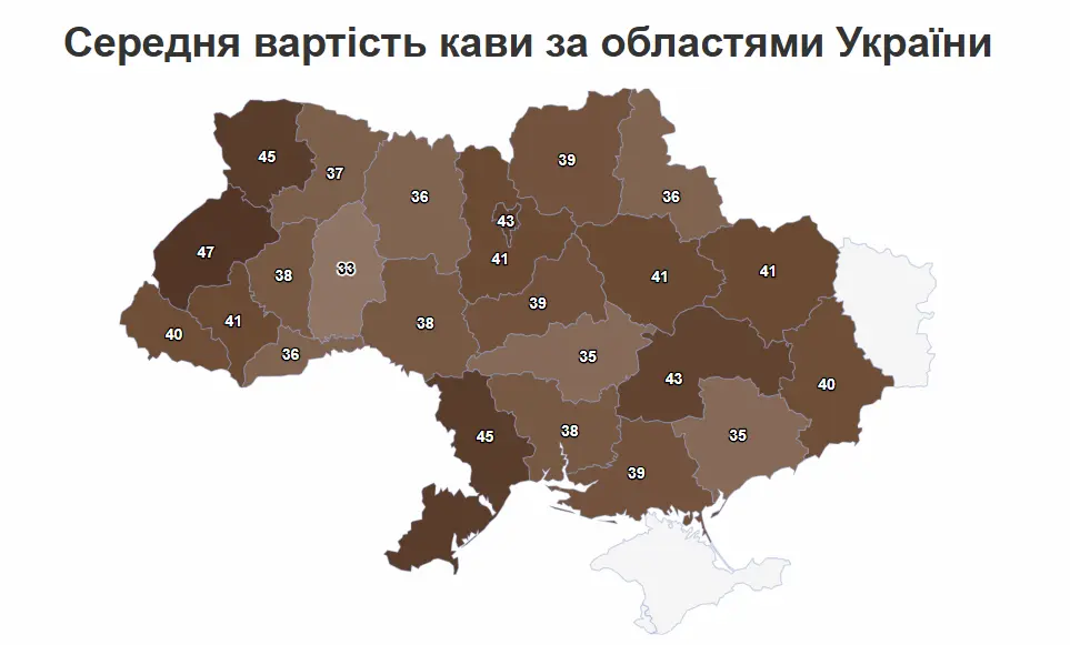 Цікаво, що в Києві кава обходиться дешевше — в середньому 43 гривні за порцію. У південних регіонах ціни нижчі: в Миколаївській області еспресо коштує близько 38 гривень, а в Херсонській — приблизно 39 гривень.