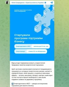 В Україні запустили ініціативу підтримки малого бізнесу, про це повідомила прем’єр-міністерка України Юлія Свириденко.
