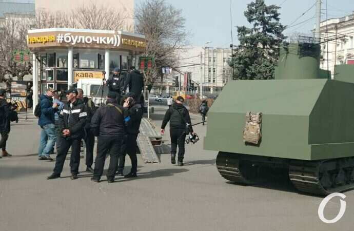 А на привокзальній площі з’явився танк… Але не зовсім звичайний – нова версія танка «На переляк». Раніше такі танки робили в Одесі під час другої світової війни.
