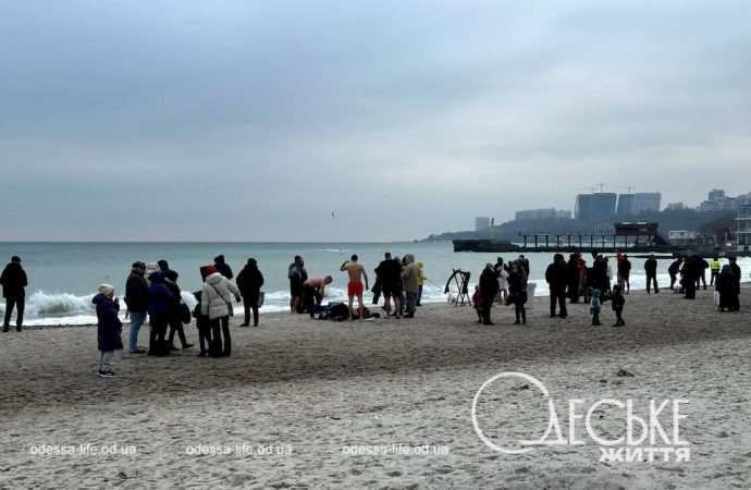 На місці чергувала водолазно-рятувальна служба, медики та поліція. Водолаз супроводжував кожного, хто вирішив святкувати пірнанням у холодне море.