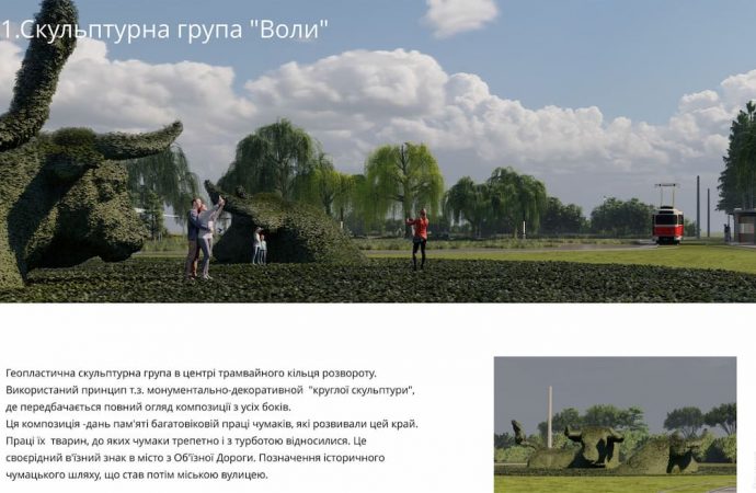 У центрі розворотного трамвайного кільця архітектори пропонують розмістити величезні геопластичні скульптури волів, як данину пам’яті чумакам, один із шляхів яких проходив у цій місцевості.