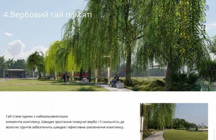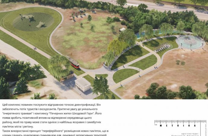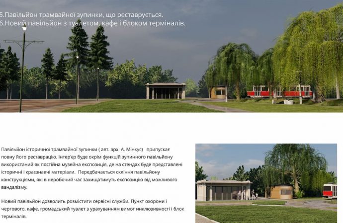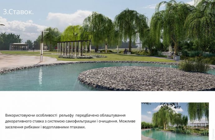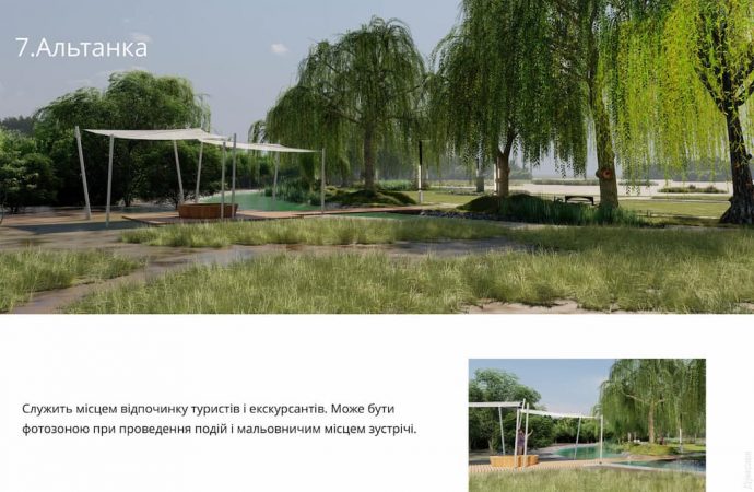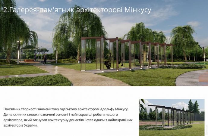 Насамперед концепція передбачає благоустрій усієї території: біля невеликого ставка з вербами розташується галерея-пам’ятка на честь архітектора Адольфа Мінкуса. Для туристів з’явиться затишна альтанка.