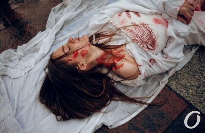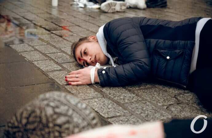 Після того, як учасники акції інсценували масові вбивства у Бучі, з динаміків зазвучали історії українців. Їх зачитував спокійний та монотонний жіночий голос. Історії про те, як одну дівчину тиждень ґвалтував російський військовий, а на очах у іншої вбили матір. Про дітей, яких вбивали просто на вулицях і тих, кому доводилося їсти собачий корм, тижнями ховаючись від бомбардувань у підвалі.