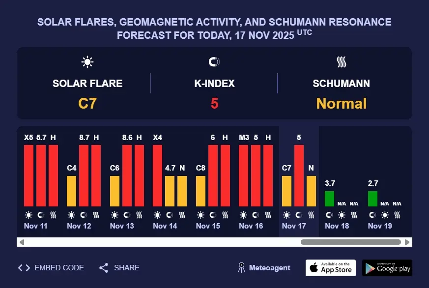 У вівторок, 18 листопада, фахівці прогнозують спокійну геомагнітну ситуацію. Очікується К-індекс близько 3,7 — це так званий «зелений рівень», що відноситься до слабких магнітних бур (G1). Подібні коливання вважаються помірними і рідко викликають помітні наслідки.