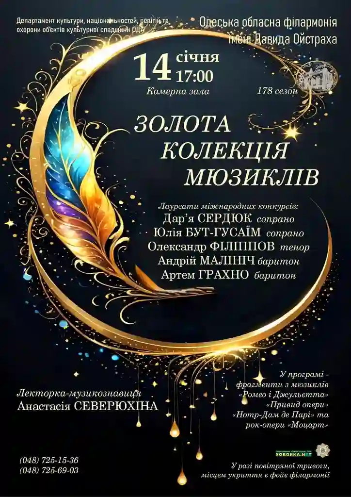 Пориньте в світ великих мюзиклів у виконанні Одеської обласної філармонії. На сцені оживуть легендарні історії з «Ромео та Джульєтта», «Нотр-Дам де Парі» та інших мюзиклів, які захоплюють мільйони сердець.