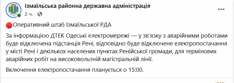 Жителі міста Рені та сусідніх населених пунктів 4 листопада залишаться без електроенергії. Причина — аварійні роботи, спричинені серйозними пошкодженнями енергомережі після нічної атаки.