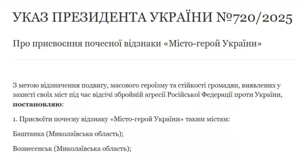 30 вересня президент України Володимир Зеленський підписав указ №720/2025, яким присвоїв місту Вознесенську в Миколаївській області почесне звання міста-героя України. Документ опублікований на офіційному сайті Офісу президента.