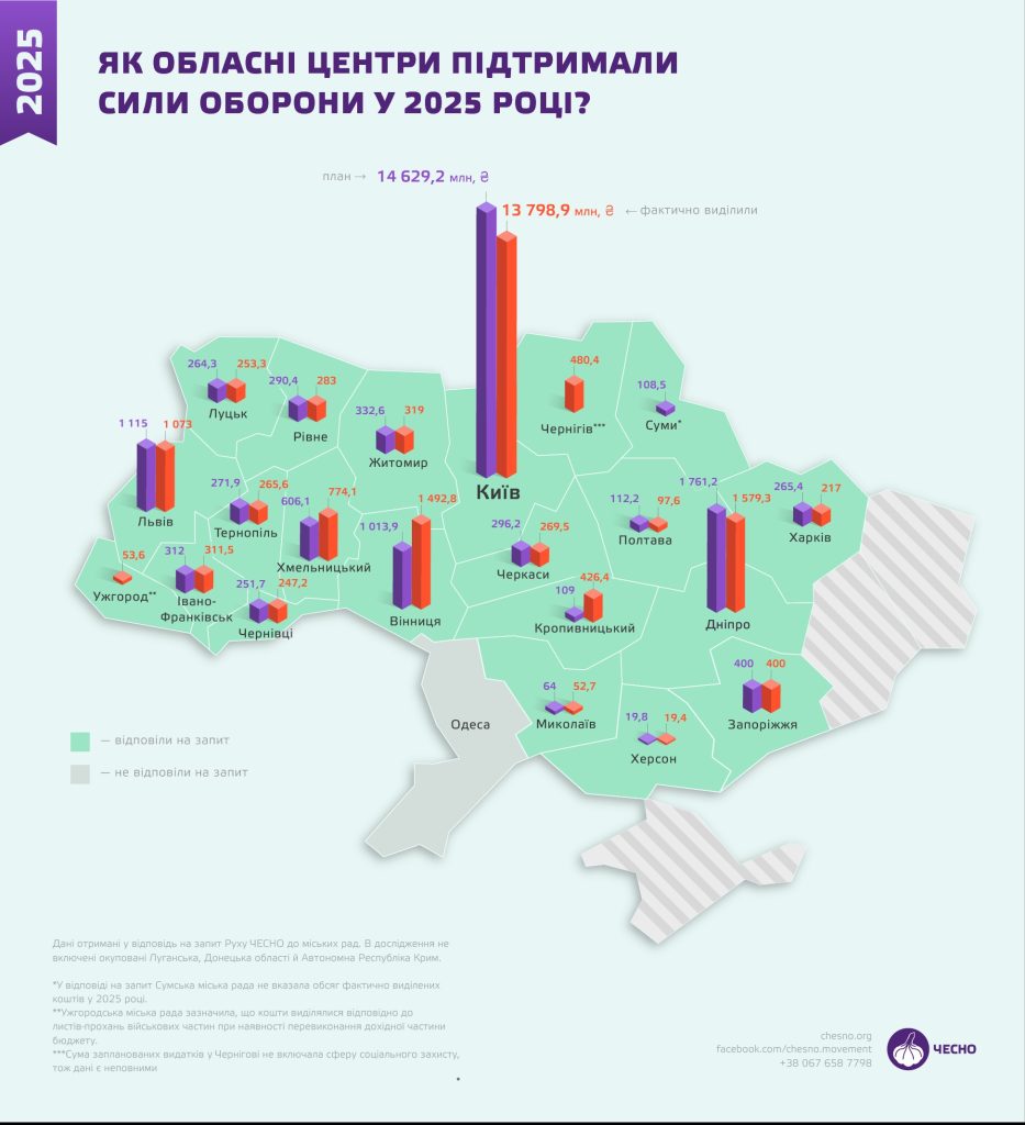 Громадський рух ЧЕСНО звернувся до міських рад обласних центрів України з запитом про витрати на підтримку Сил оборони у 2025 році. Щоправда, Одеська міська рада стала єдиною, хто не надав відповіді.