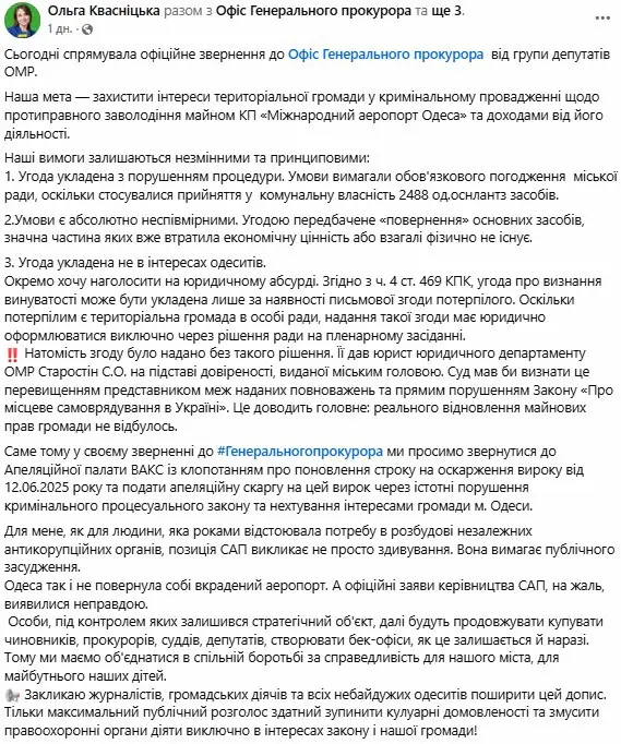 Депутатка Одеської міської ради Ольга Квасніцька назвала угоду у справі про аеропорт «юридичним абсурдом» і закликала Генпрокурора втрутитися. За її словами, громада міста не давала письмової згоди, як того вимагає закон.