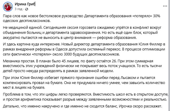 За словами Гриб, нова очільниця департаменту освіти Юлія Філлер під час впровадження реформи в Одесі допустила суттєвий системний зсув. У ході оптимізації мережі шкіл фактично “зникли” близько 3000 майбутніх учнів 10-х класів.