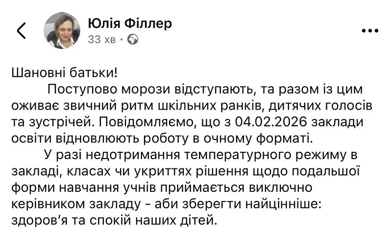 «Поступово морози відступають, і разом із цим оживає звичний ритм шкільних ранків, дитячих голосів та зустрічей. Повідомляємо, що з 04.02.2026 заклади освіти відновлюють роботу в очному форматі», – написала чиновниця у Facebook.