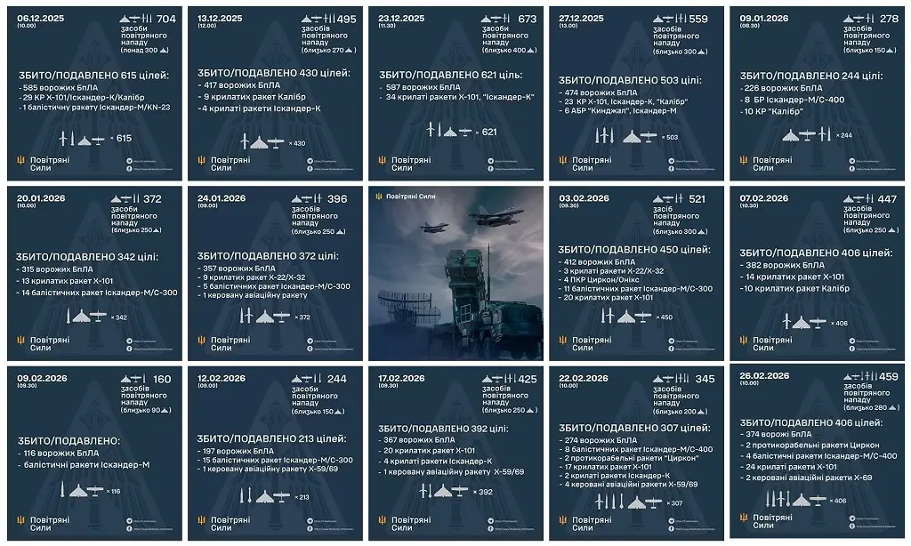 За грудень-січень ворог здійснив 7 масованих ударів із застосуванням ракет та дронів різних типів. Протягом лютого інтенсивність атак зросла удвічі – Україна витримала ще сім масштабних обстрілів.