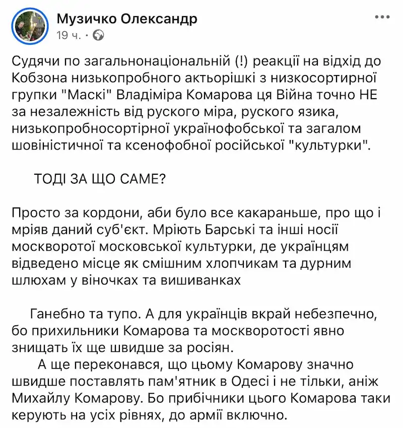 Олександр Музичко і раніше робив ультрарадикальні заяви. Зокрема, він стверджував, що ЗСУ «недостатньо українські», а також що нібито російськомовні військові стріляли в україномовних.