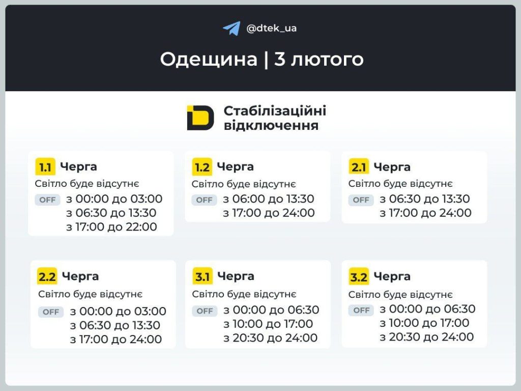 У вівторок, 3 лютого, в частинах Одеської області, де є технічна можливість, застосовуються графіки стабілізаційних відключень.
