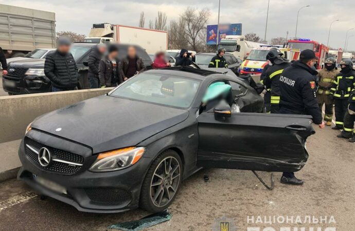 У Національній поліції України розповіли, що сьогодні о третій годині дня на Київській трасі автомобіль KIA Cerato, повертаючи ліворуч, зіткнувся з автомобілем Mercedes, що рухався йому назустріч.