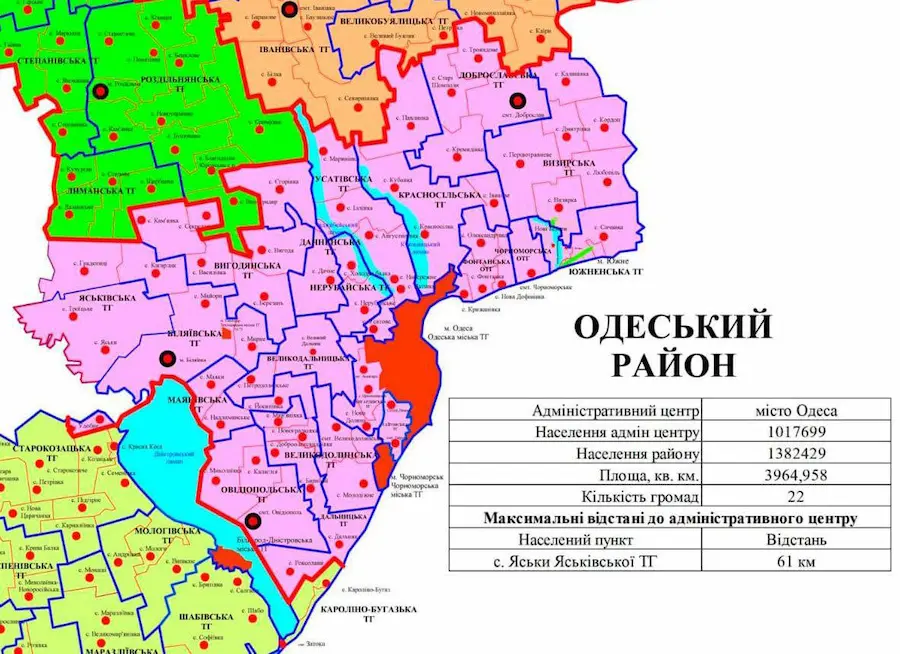 Одеський район включає 22 територіальні громади. Серед них міста Одеса, Чорноморськ, Південне, Теплодар і Біляївка, селища Авангард, Доброслав, Овідіополь, Таїрове і Великодолинське, а також ряд сільських громад, включаючи Усатове, Нерубайське, Фонтанку, Красносілку та інші.