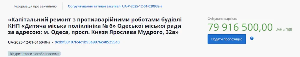 У системі Prozorro оголошено новий тендер на капітальний ремонт дитячої поліклініки №6 на проспекті Князя Ярослава Мудрого. Сума проекту — 79,9 млн грн.