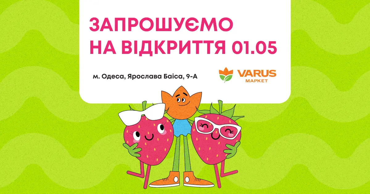 1 травня в Одесі відкриється новий магазин VARUS за адресою: вул. Ярослава Баїса, 9-А. Новий компактний простір створено з урахуванням щоденних потреб клієнтів — тут зручно швидко знайти базові продукти: свіжі овочі та фрукти, випічку, снеки й готові страви від VARUS CAFE.