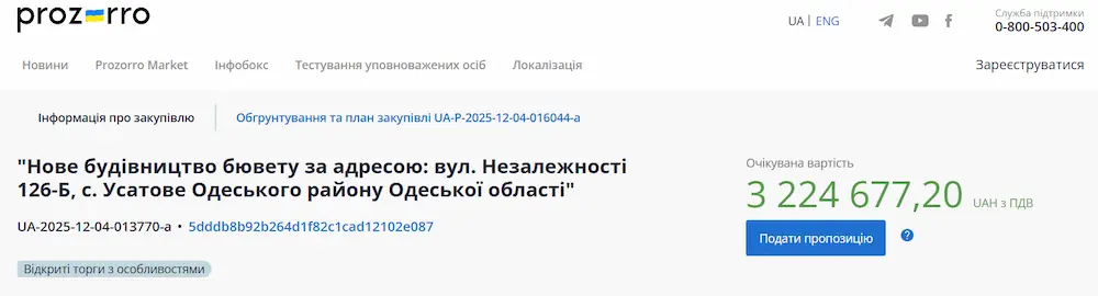На платформі державних закупівель Prozorro з’явилася інформація про плани побудувати новий бювет за адресою вул. Незалежності, 126-Б в Усатовому Одеського району.