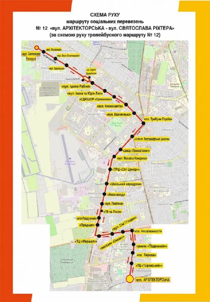 Як повідомили у пресслужбі міської ради, новий маршрут повністю повторює схему руху тролейбуса №12, з’єднуючи Київський та Хаджибейський райони. Автобуси курсують між вулицями Архітекторською та Святослава Ріхтера. Шлях проходить через ключові артерії міста: вулицю Академіка Корольова, проспекти Князя Ярослава Мудрого (колишній Глушка) та Небесної Сотні, вулицю Комарова, площу Трибуни Героїв (колишня Толбухіна), вулицю Академіка Філатова та площу Бориса Дерев’янка.