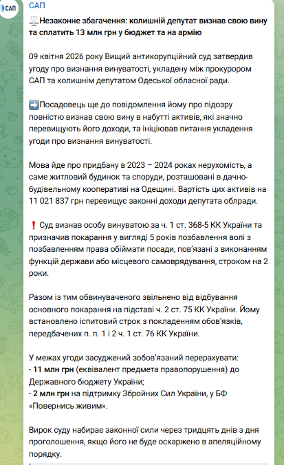 За інформацією Спеціалізованої антикорупційної прокуратури (САП), 9 квітня 2026 року Вищий антикорупційний суд затвердив угоду про визнання винуватості між прокурором САП та ексдепутатом.