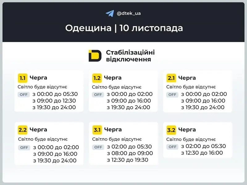 Завтра, у понеділок, 10 листопада 2025 року, відповідно до розпорядження «Укренерго», в Одесі та Одеській області, як і в низці інших регіонів України, продовжать застосовуватися стабілізаційні відключення електроенергії. Вони введені через складну й нестабільну ситуацію в енергосистемі країни після російських ракетно-дронових атак на енергооб’єкти.